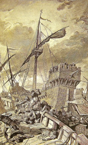 when suddenly a violent storm arose, dividing the Christians fleet from the Muslim attackers. Christian ships made it back to port, but Muslim ship were decimated by the storm, and afterwards easily captured.