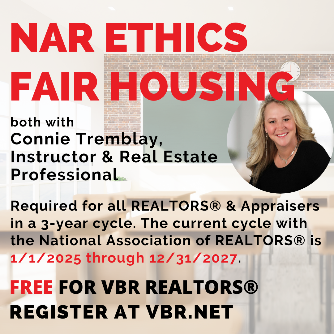 Visit VBR's Education Requirements page for more info on NAR's Code of Ethics, the new Fair Housing course requirement, state license cycle requirements, and more. The link below includes a helpful tracking sheet you can use.