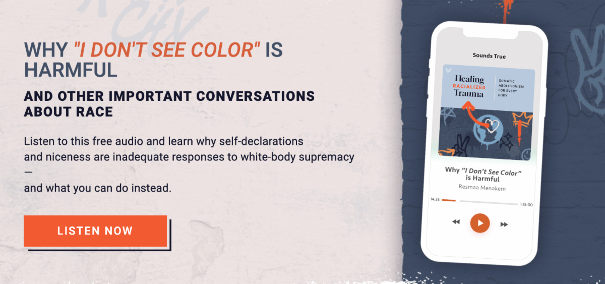 In this eye-opening free audio session from our friends at Sounds True, renowned expert on race and trauma Resmaa Menakem shares why responses such as “I don’t see color” fall short.