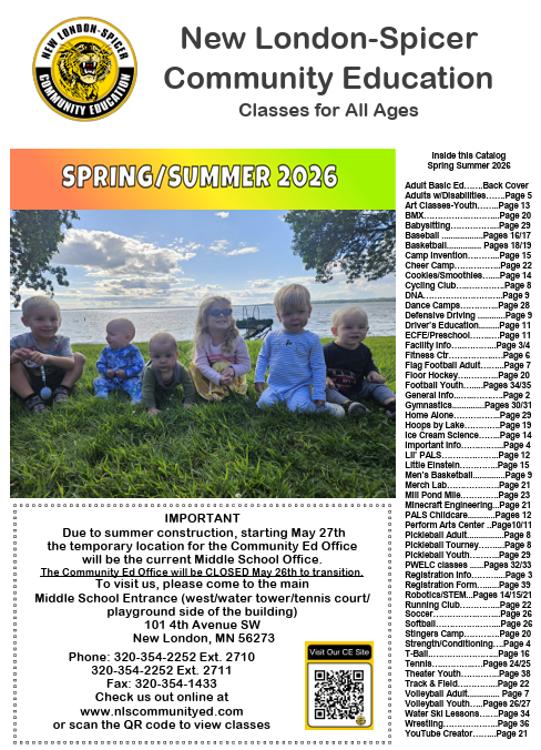 We've entered spring with summer just around the corner! New London-Spicer Community Education is excited to once again offer a wide range of opportunities for our entire community from our youngest learners to our senior citizens. Whether you’re looking for engaging youth programs, enriching classes, or recreational activities, there is something for everyone to learn, connect, and stay active.