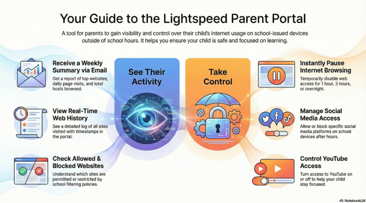 NLS offering an optional resource to support students’ digital well-being at home: Lightspeed for Parents. This tool allows parents and guardians to view online activity and receive alerts related to school-issued Chromebooks only, similar to the visibility teachers have during the school day. Families can use the portal to support healthy digital habits and partner with the school in promoting safe, responsible technology use. Please note, Lightspeed for Parents does not monitor personal devices.