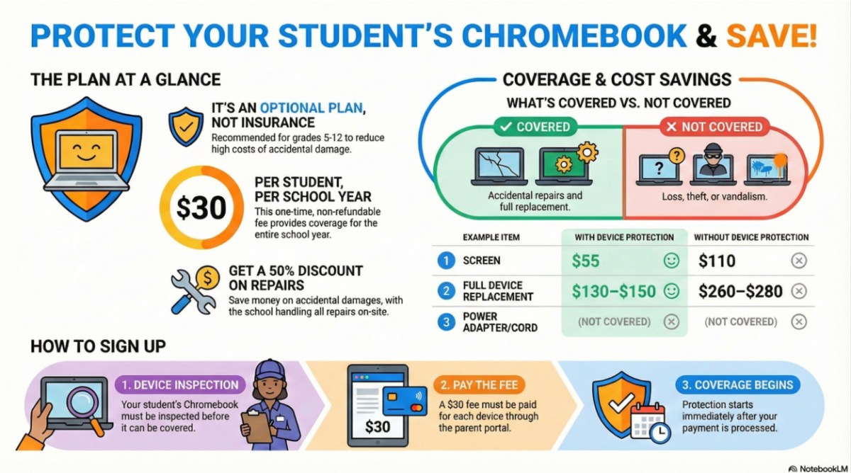 Our Technology Department has received a few questions from parents regarding our Optional Device Protection Plan. To help clarify the details please reference the visual overview that explains what the plan includes;