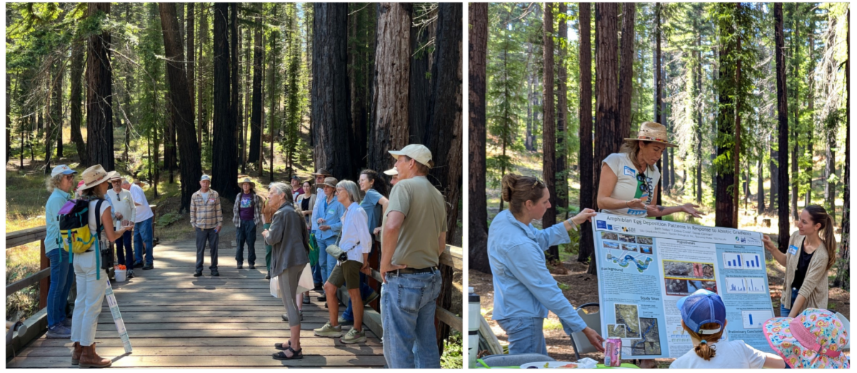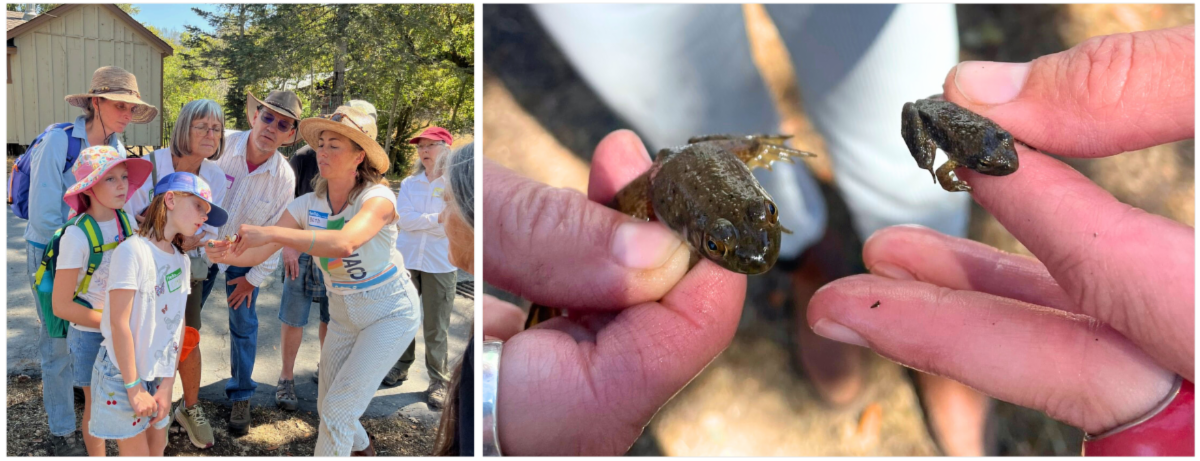 | | Reflections on Our Picnic at Rancho Mark West | | Herpetologist Beth Sabo shows examples of two different frog species. On the left is the non-native and invasive American bullfrog and on the right is the native foothill yellow-legged frog. | | |