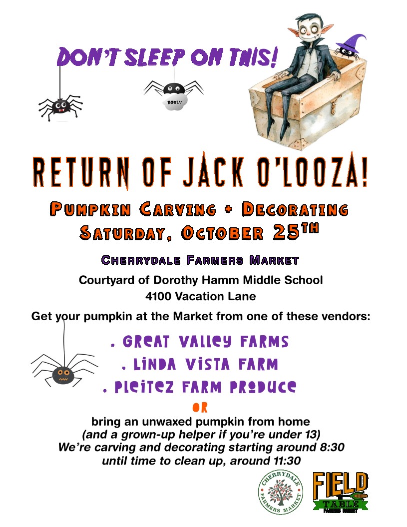 Cherrydale Farmers Market is hosting its second annual Jack O'Looza. Kids and families are invited to carve and decorate pumpkins at the market, on the morning of Oct. 25 in the courtyard overlooking the soccer field at the Dorothy Hamm Middle School. We would like to invite your families and kids to come out and decorate pumpkins with us. Kids under 13 should be accompanied by a trusted adult. ere is our Facebook Event Page.