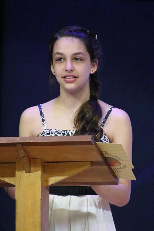 Along with sharing their poems, Addie, Eva and Lydia spoke about their sixth-grade trip to New York, where they visited the United Nations and attended the