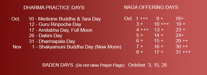 Most of the days of the eighth lunar month are auspicious for making offerings. In particular, October 4th, 10th (Medicine Buddha day), 14th, 17th (full moon), and 31st (Dharmapala day) are best. The days to especially avoid are the 12th (Guru day) and the 21st.
