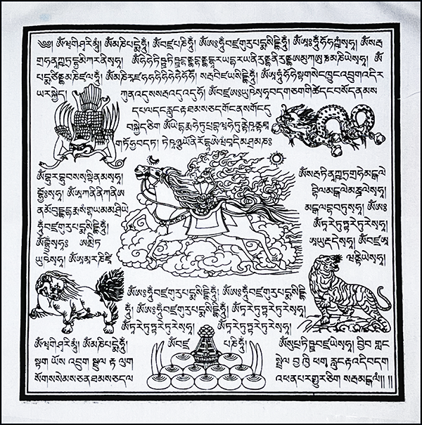 The Windhorse flag is the most popular design of Tibetan prayer flags. The many sizes and various designs of Windhorse flags all have the figure of a Windhorse in the center; usually carrying the flaming wish-fulfilling jewel of enlightenment. The Four Auspicious Animals reside in or near the 4 corners. The rest of the flag may contain various other sacred symbols, prayers, sutras, and mantras.
