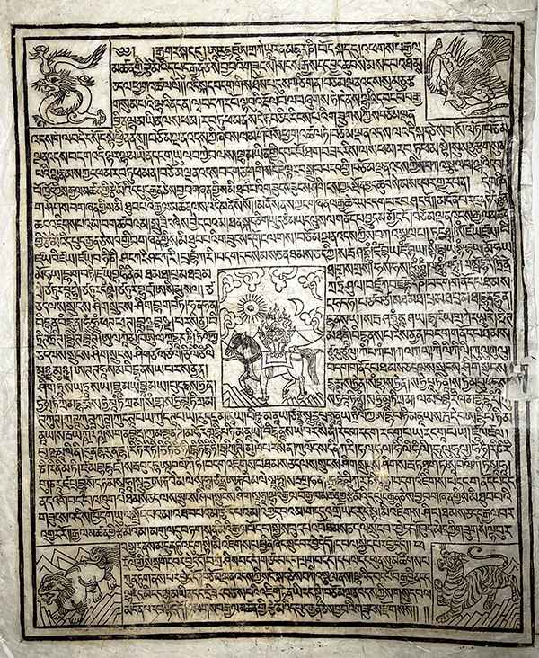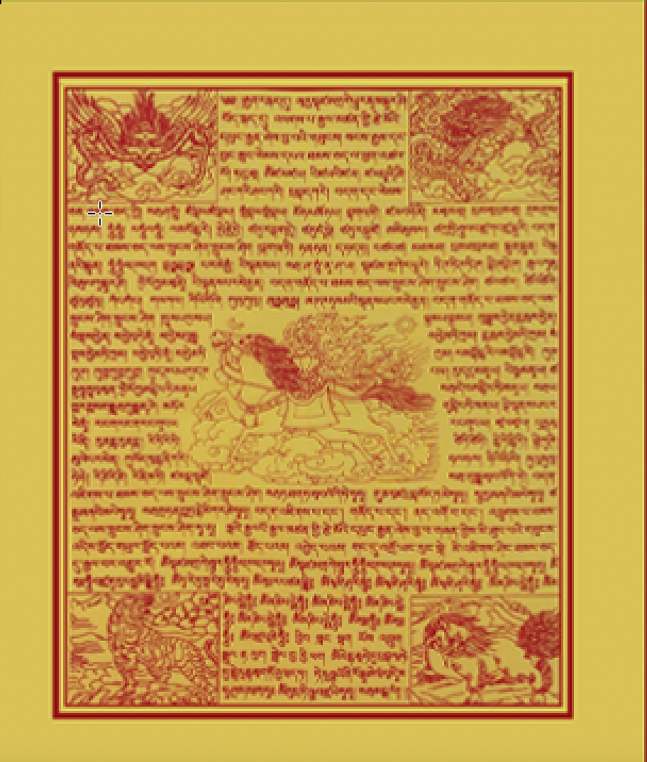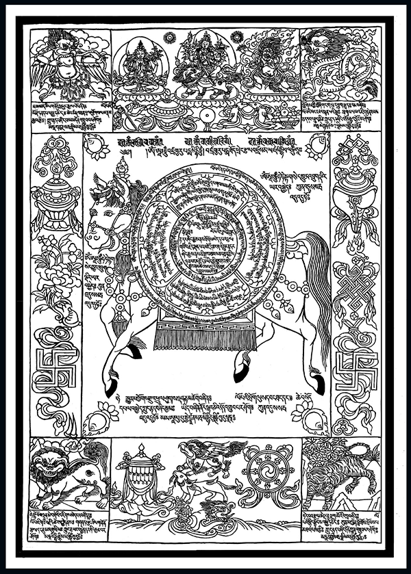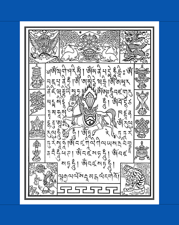 I drew the Windhorse design above in 1976 and have been printing it for more than 45 years. The Wind Horse carries the wish fulfilling jewel of enlightenment and the 4 Auspicious Animals in the corners. I added the Eight Auspicious Symbols down the sides. At the top is a symbolic representation of the Buddhas's first teaching at Deer Park. The text inscribes the mantras of many deities: Manjushri, Avolokiteshvara, Vajrapani, Amitabha, Amitayus, Padmasambhava, The Peaceful Deities, the Wrathful Deities, Tara, Vajrakilaya, and Vajrasattva.