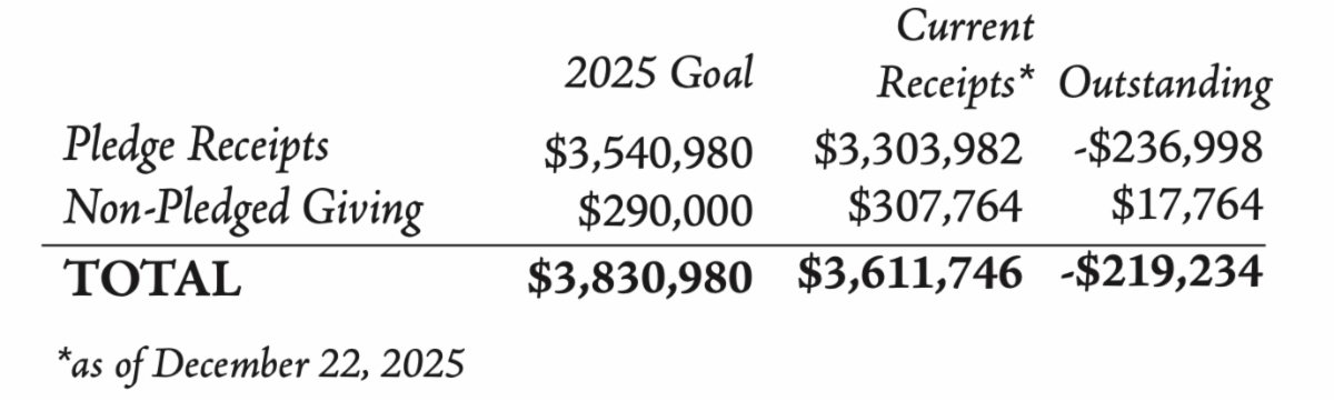 Thank you for your faithful contributions to the life and mission of our community of faith. We encourage you to fulfill your 2025 pledge to help us meet our annual goal.