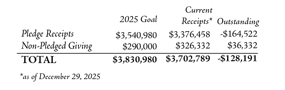 Thank you for your faithful contributions to the life and mission of our community of faith. We encourage you to fulfill your 2025 pledge to help us meet our annual goal. To be deductible in 2025, your gift must be received or postmarked by midnight on Wednesday, December 31. The church office will be open until 5:00 p.m. on December 31.