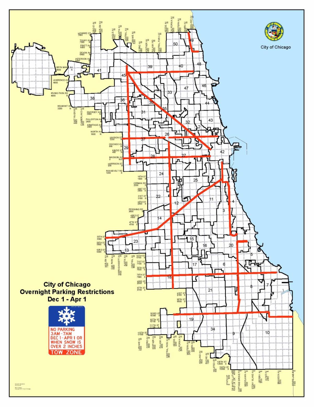 Cars left parked on these designated roadways obstruct the path of snowplows and prevent routes from being fully plowed and salted when it snows. Violators of the parking ban will be towed and face a minimum $150 towing fee, a $60 ticket, and a storage fee of $25 per day. Vehicles in violation of the ban will be towed to Pounds 2 (10301 S. Doty Ave.) or 6 (701 N. Sacramento).