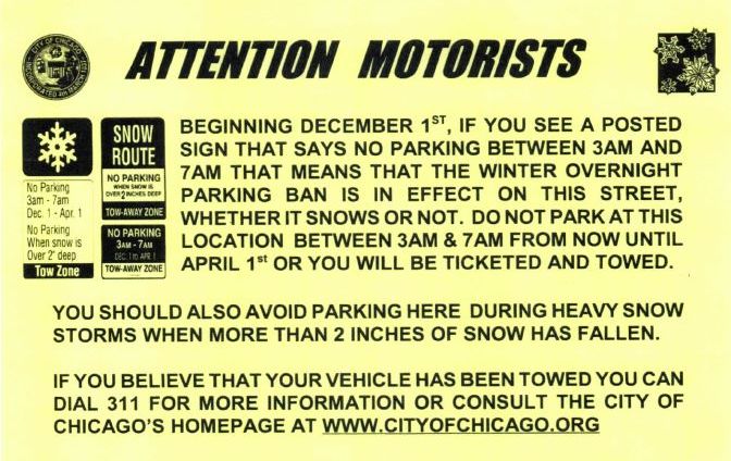 The Department of Streets and Sanitation (DSS) reminds motorists that the Chicago winter overnight parking ban began on Monday, December 1, 2025, and is in effect through April 1, 2026. The parking ban is enforced regardless of snow on 107 miles of main streets throughout the city during the hours of 3:00 a.m. to 7:00 a.m.