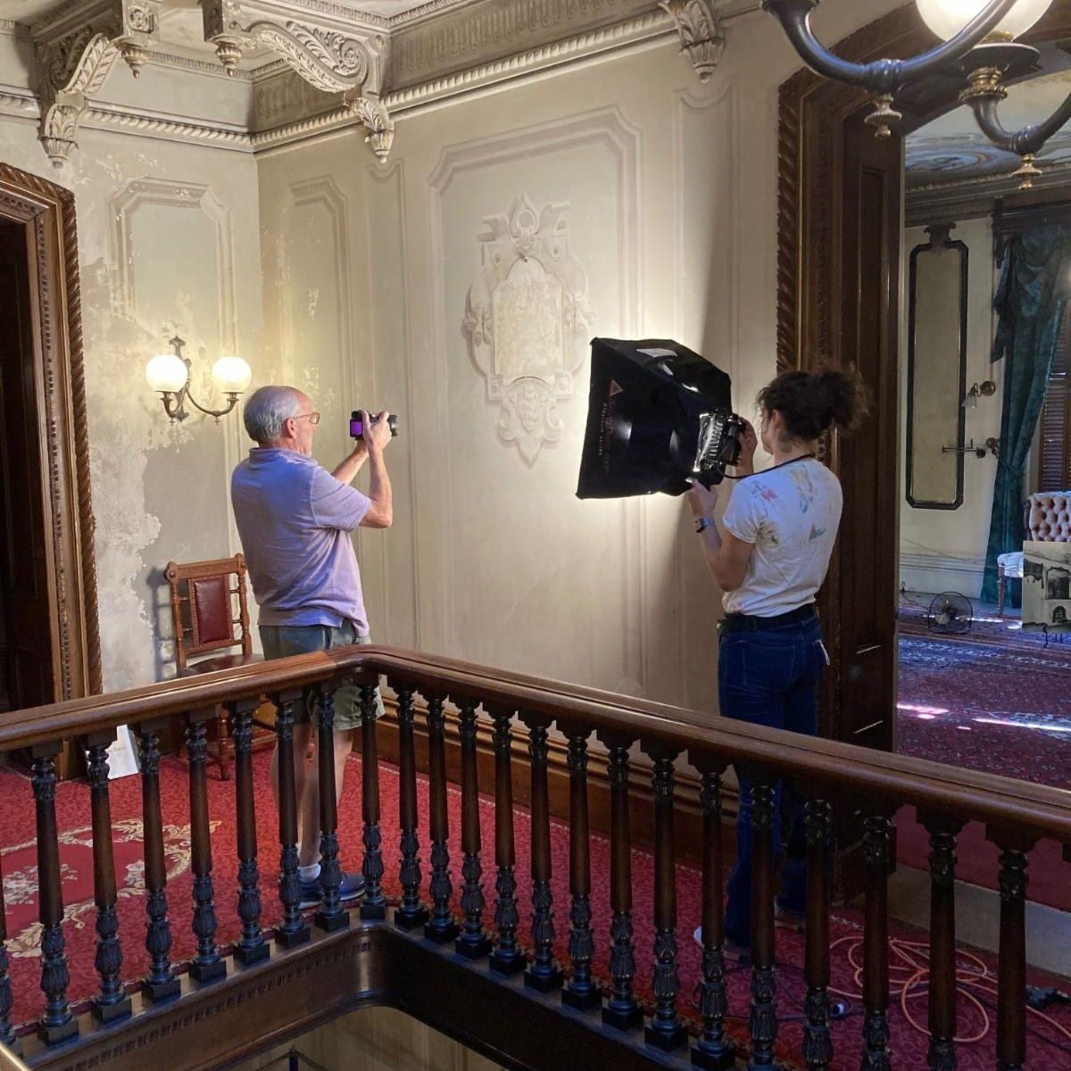 Paintings conservators Gianfranco Pocobene and Corrine Long take infrared photos of the trompe l'oeil frames on the second floor prior to beginning conservation. Tests were done to determine if graphite was used to write portrait information on the walls before paint was applied.