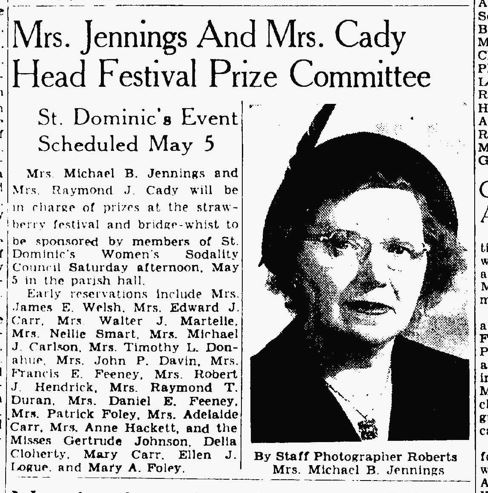 This Portland Press Herald article from April 26, 1951 highlights Sabina Grady's activities at St. Dominic's Church, today home of the Maine Irish Heritage Center, down the street from Victoria Mansion.
