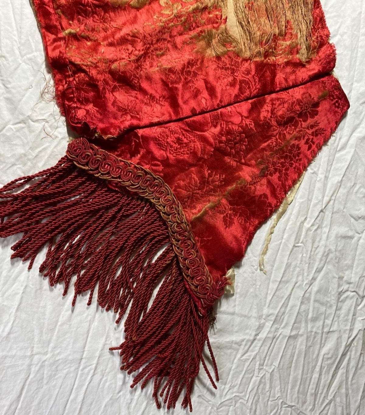Fragile Red Bedroom textiles laid out for cleaning by Conservation Technician Vivian Cunningham. Textiles are kept in climate-controlled storage in the former trunk room on the 3rd floor of the Mansion.