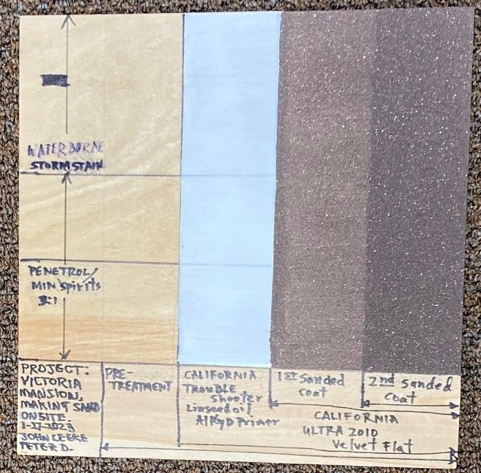 Sand painting sample panel by longtime Mansion consultants John Leeke and Peter De Paolo, from pre-treatment (left) to primer (center) to one and two coats of paint with brownstone sand blown in (right).