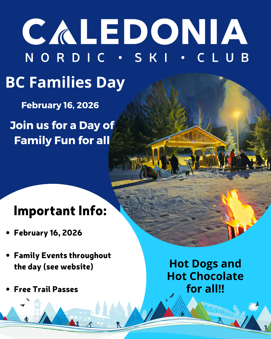 - 11:30 am – 2:00 pm – Test your ski legs, and head out to the gravel pit for a wiener roast, and hot chocolate. Hot dogs are by donation. Proceeds going to the food bank. Please bring cash, and please give generously.