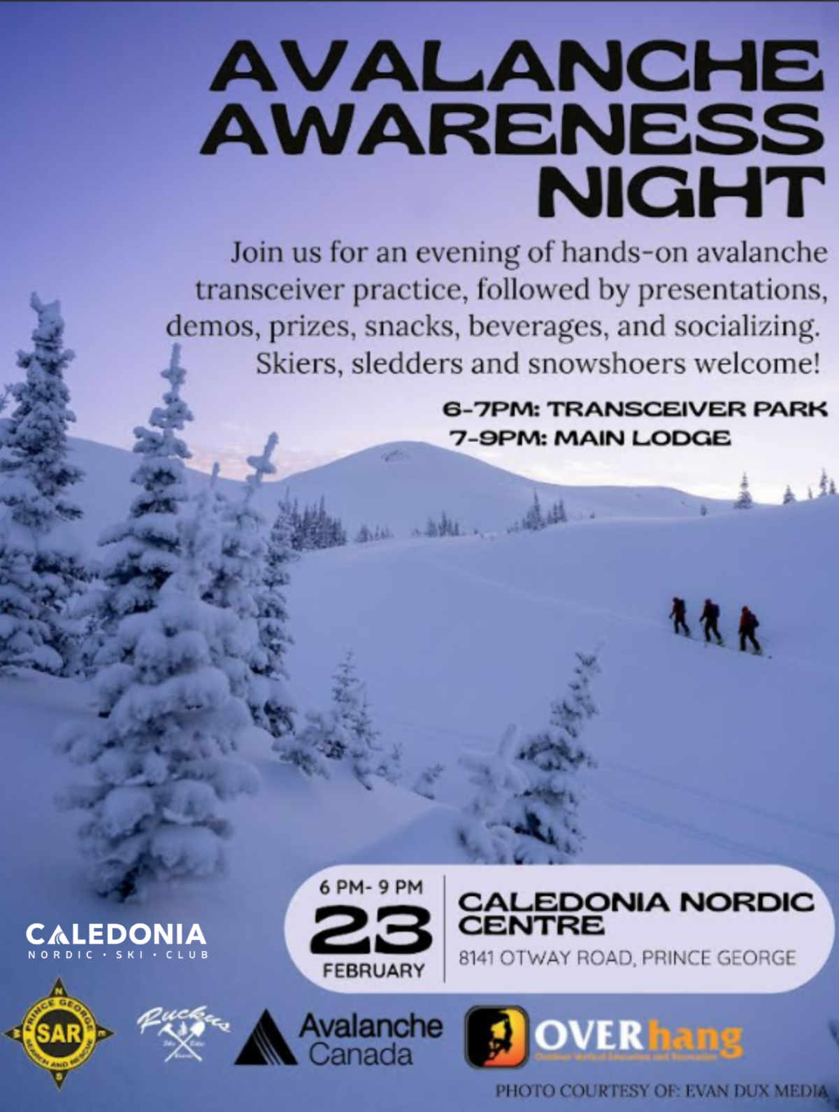 We are excited to invite members and the broader community to an Avalanche Awareness Night, hosted in partnership with Prince George Search and Rescue, Ruckus, Avalanche Canada, and our friends at Overhang.