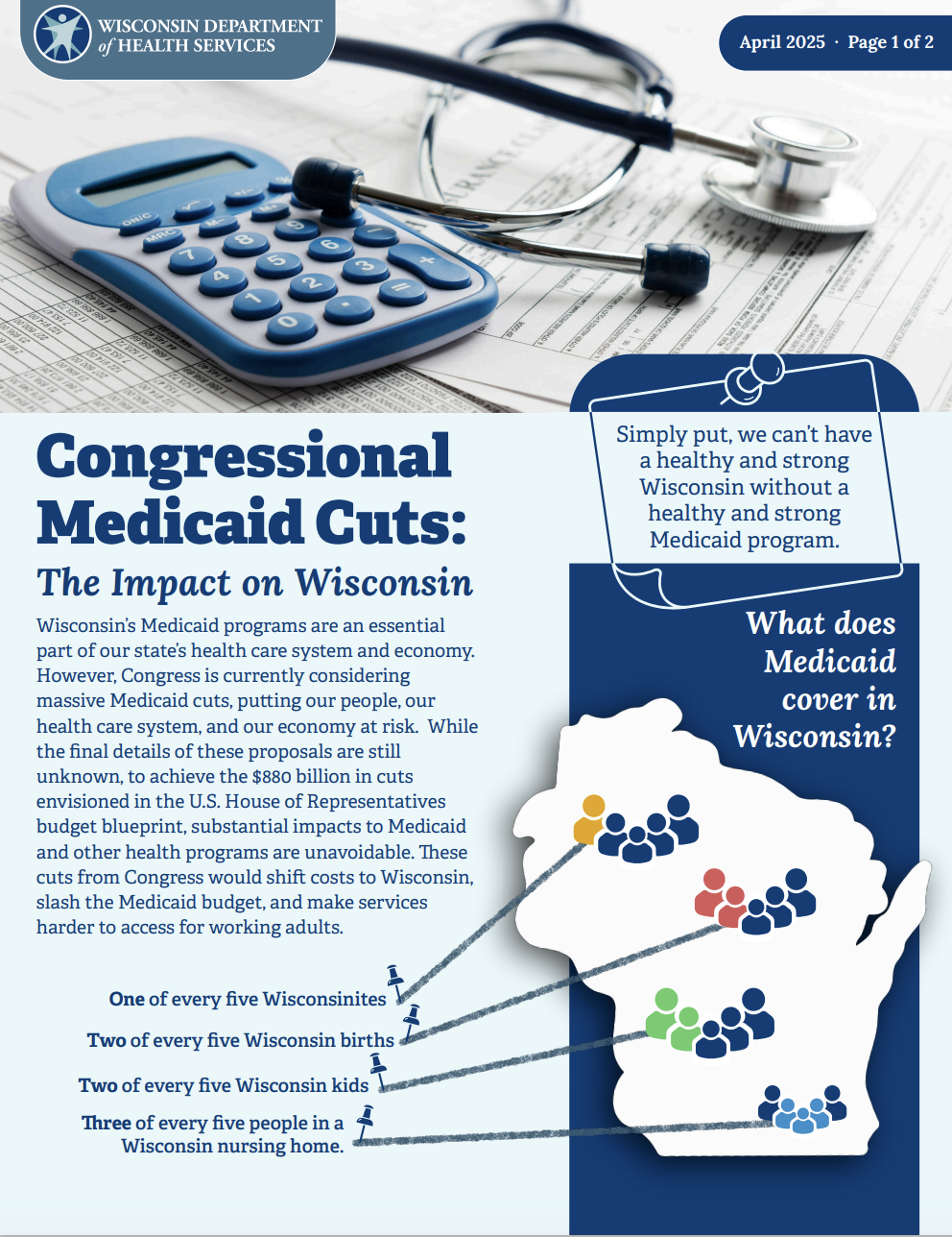 The Department of Health Services (DHS) released a statement on the impact of federal budget cuts on Wisconsin Medicaid members in addition to an analysis of the potential impacts of the cuts. The U.S. House of Representatives is proposing as much as $880 billion in Medicaid cuts over ten years, and DHS wanted to analyze these potential cuts and the associated impact, including shifting costs, making services harder to access for working adults, and increasing costs to Wisconsin taxpayers. They found Wisconsin could lose up to $16.8 billion in federal funding if a per-person funding cap for Medicaid is implemented.