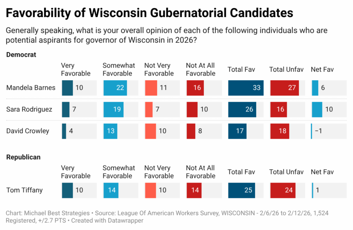 The conservative group League of American Workers released new polling this week showing former Lt. Gov. Mandela Barnes leading the field of Democratic candidates in the gubernatorial race, despite 35% of respondents saying they were undecided. Of those who said they plan to vote in the Democratic primary for governor, 28% supported Mr. Barnes and 20% supported current Lt. Gov. Sara Rodriguez. Milwaukee County Executive David Crowley received 7% support, followed by State Rep. Francesca Hong at 5%, State Sen. Kelda Roys at 2%, former WEDC CEO Missy Hughes at 1%, and Brett Hulsey at 1%.