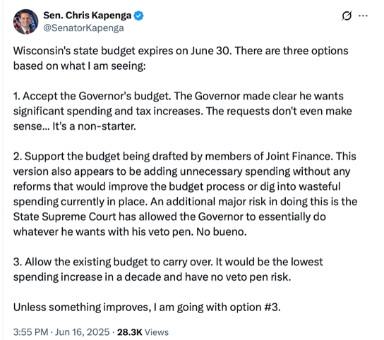 Sen. Nass (R-Whitewater), in a statement also publicly criticized the emerging budget framework as fiscally irresponsible, citing “too much spending, special interest pork, and the creation of a structural deficit.”