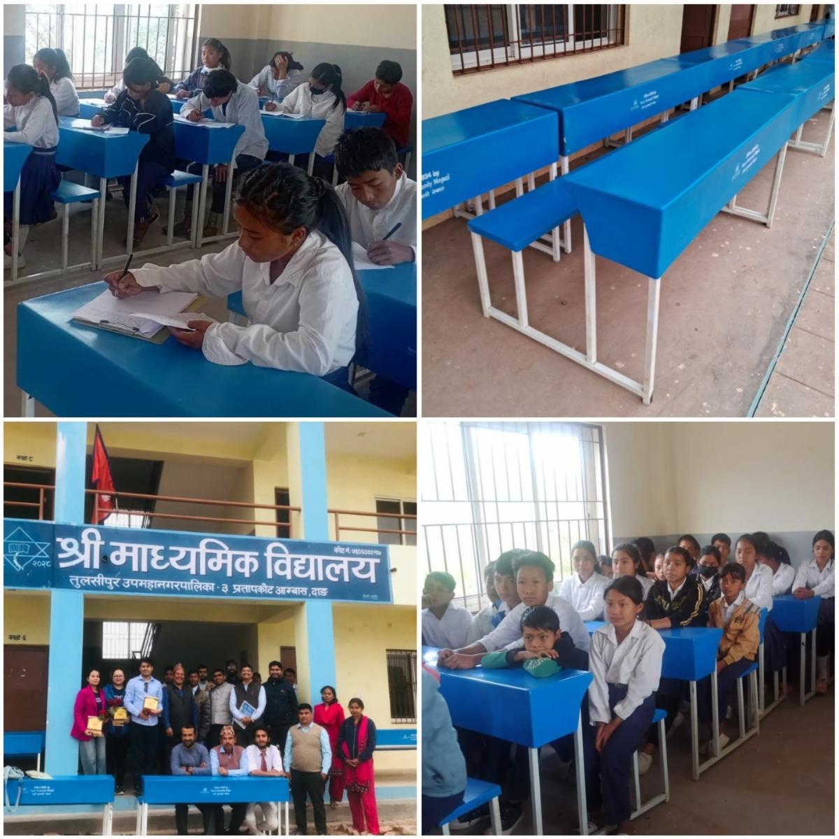 Yours Humanly provided multiple sets of newly built, bright blue desks and benches for classrooms in an impoverished community school in Nepal’s Dang district, home to 200+ students from kindergarten to Grade 10. The furniture was custom ordered with a sturdy design for classroom use. While we were unable to provide new desks for every single student and teacher, the desks we did provide are already facilitating a better learning environment. Each desk and bench set can comfortably seat four students—five if they are younger—and comes with storage space for books and stationery.