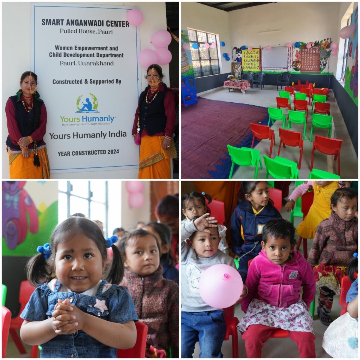 In April, Yours Humanly celebrated the opening of the Smart Anganwadi Center, a newly constructed Yours Humanly Day School in Pauri, Uttarakhand, India, for children ages 3-6, who come from impoverished backgrounds. These children live in wage worker households, where they are often left on their own while their parents are working. With no supervision or structured pre-school, many children are ill-prepared when they enter public school in Grade 1. To address this gap, Yours Humanly funded the construction of the Yours Humanly Day School, and is providing school supplies, educational resources, books, furniture, and teacher salaries. Here, preschoolers spend their days in a safe and structured environment, with two full meals a day and quality learning and socializing, getting ready for public school.