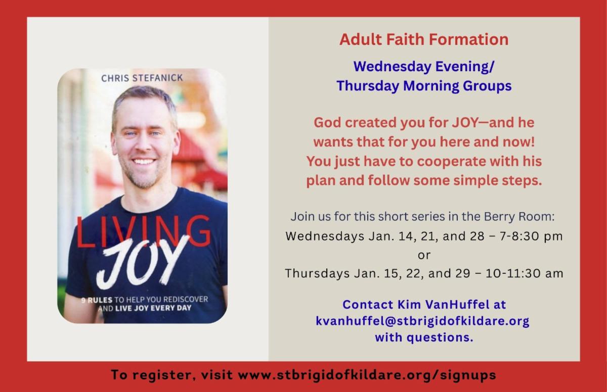 Join us for this short series on Wednesdays, January 14, 21, and 28 from 7-8:30 PM, or Thursdays, January 15, 22, and 29 from 10-11:30 AM in the Berry Room. Contact Kim VanHuffel for more information at kvanhuffel@stbrigidofkildare.org.