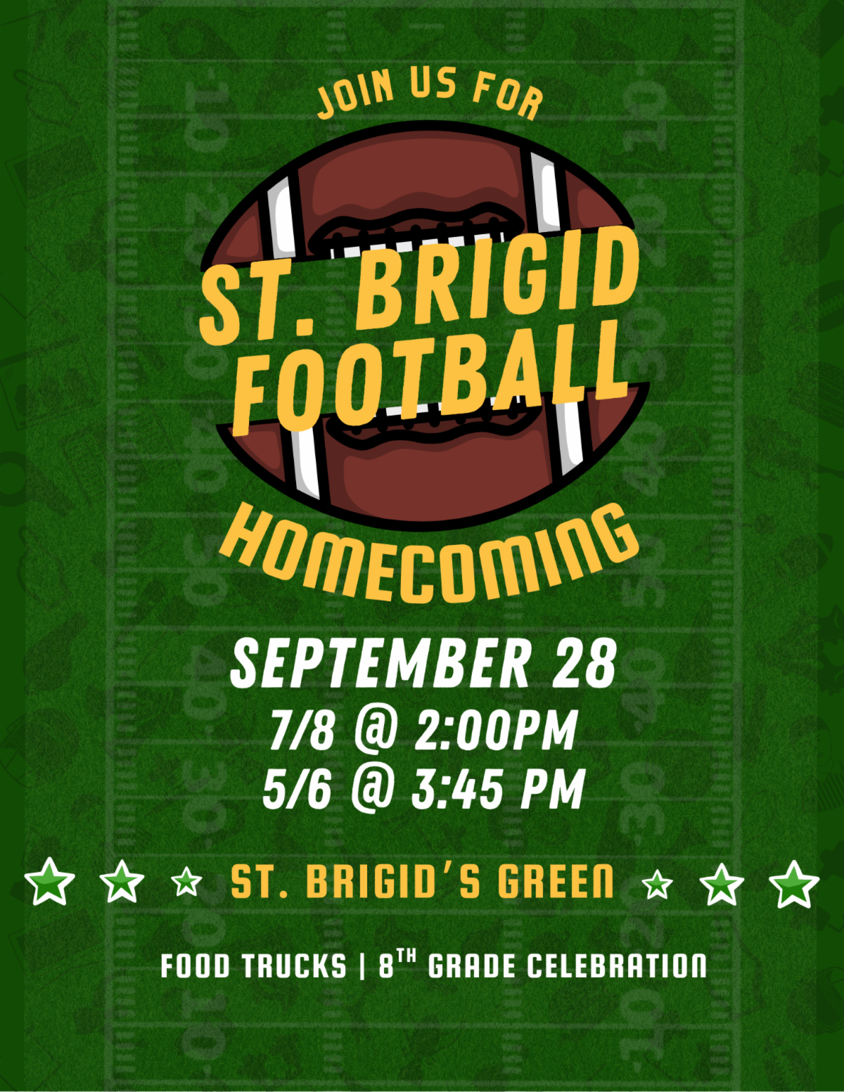 Come to Brigid's Green to cheer on our St. Brigid Football teams and cheerleaders at our Homecoming event!