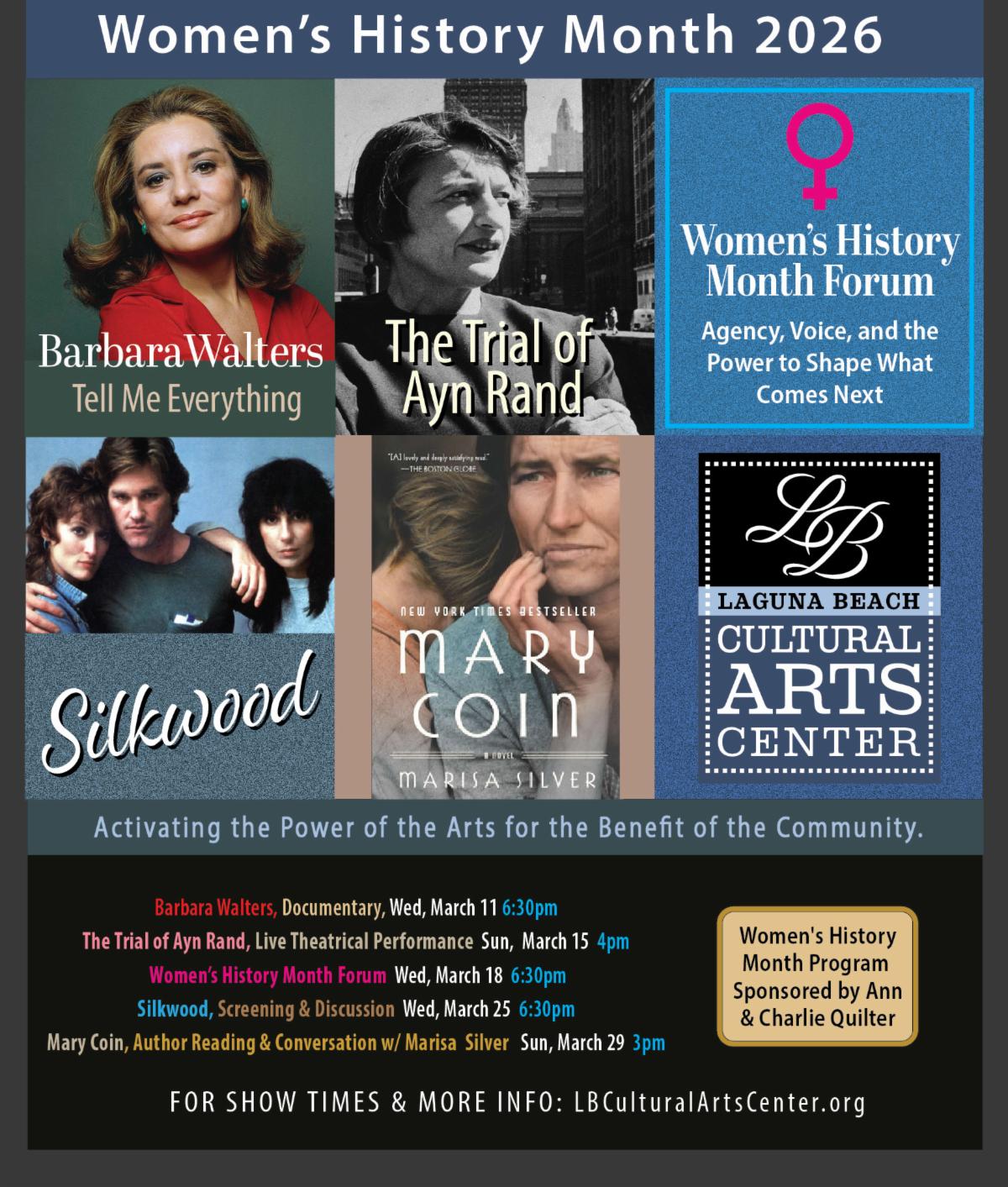 This year’s Women’s History Month at the Laguna Beach Cultural Arts Center features a thoughtfully curated series of films, performances, discussions, and literary events, each offering a unique lens on women’s voices, leadership, and impact. Click any event above for full details and to RSVP.