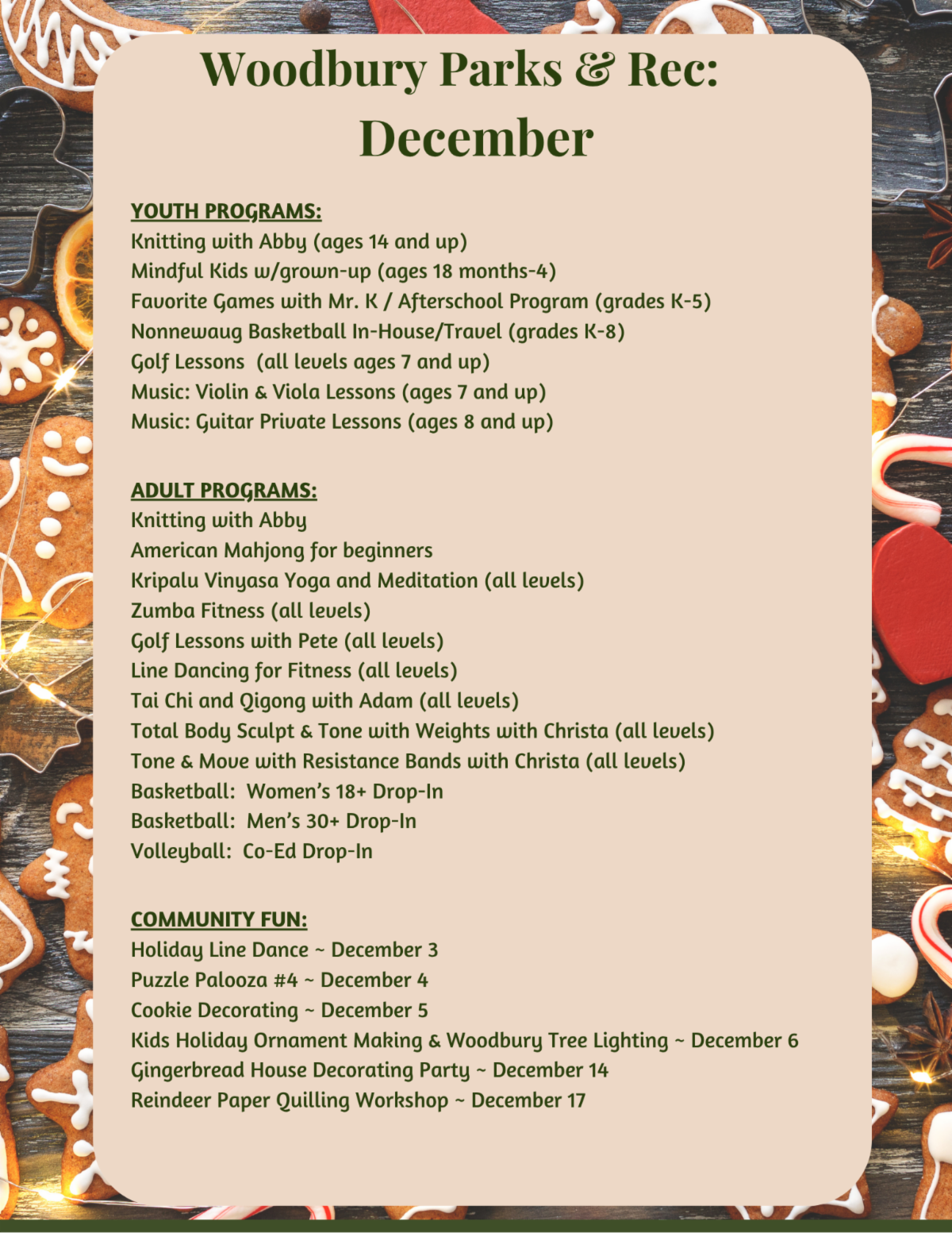 As we look forward, I’m excited for everything that we have planned for December. On December 6th, we will be hosting the Tree Lighting on the North Green. We invite everyone to attend as we sing carols, light the tree, and celebrate the holiday season. As part of the decorating for the tree, we have ornaments available at our office, the library, and the senior center. We are inviting people to come pick up an ornament, decorate it, and then bring it back so we can add it to the tree. I know I’m looking forward to seeing that tree light up in my first year here. We are also hosting a separate ornament making workshop before the Tree Lighting. From 1:30pm-3:30pm on December 6th, stop by the Rec House and decorate your very own ornament to take home and add to your own tree. This is a free workshop and we will also be providing a hot cocoa buffet.