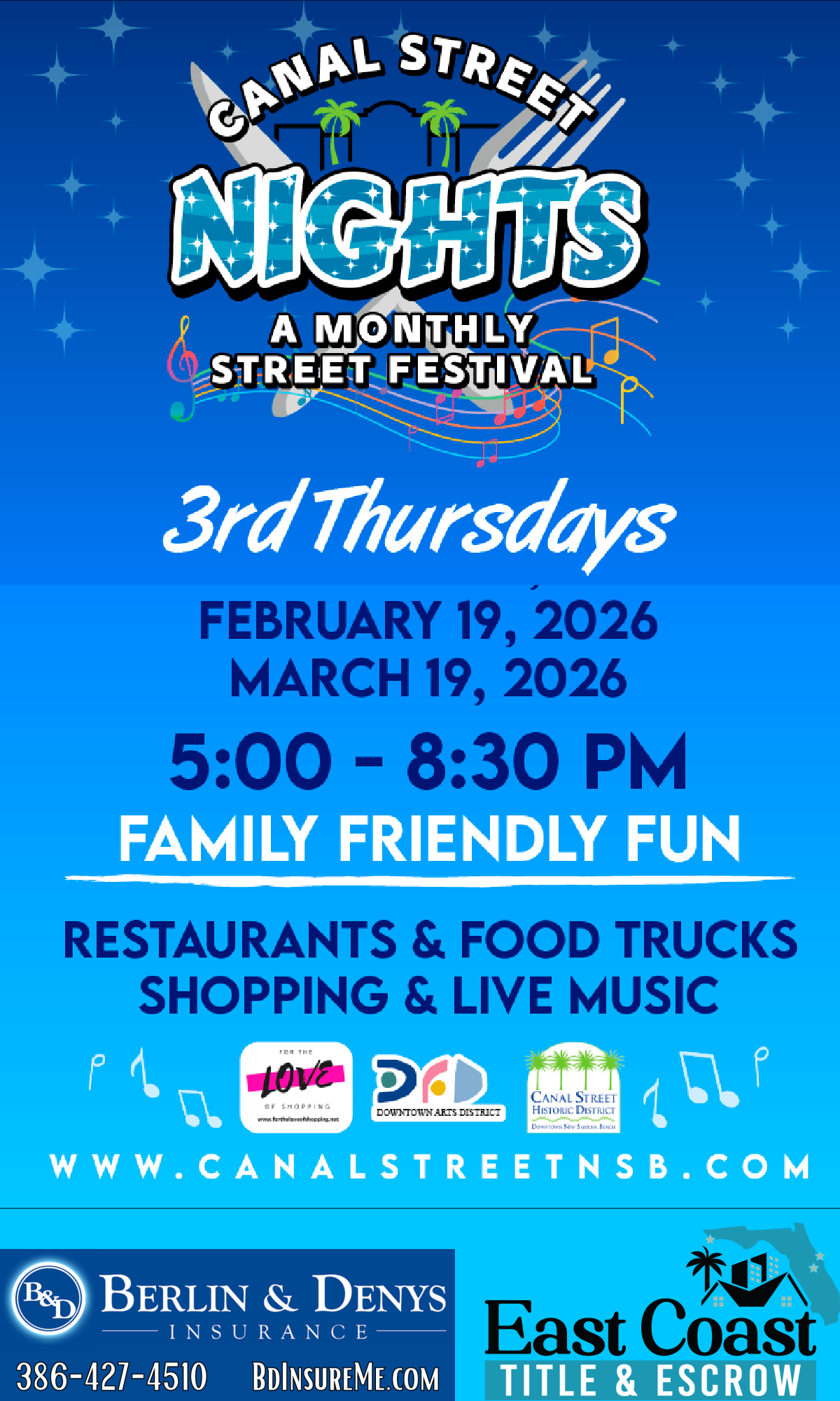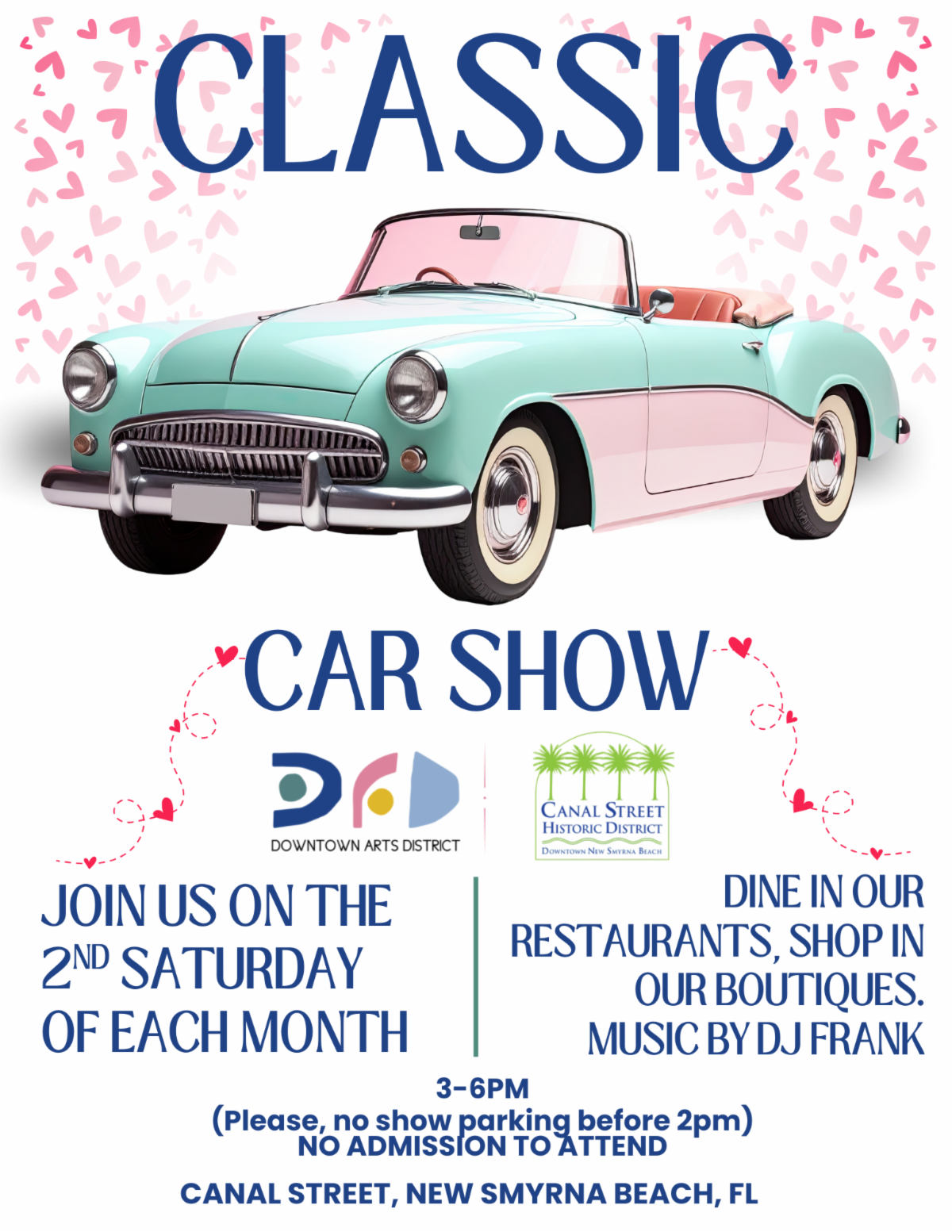 Every month on the second Saturday. Stroll beautiful Canal Street while viewing cars of all years, makes, and models. A new beginning for the tradition with the active participation of the Canal Street Merchants Association and the City of New Smyrna Beach. Music by DJ Frank.