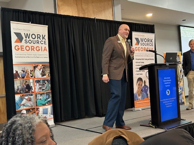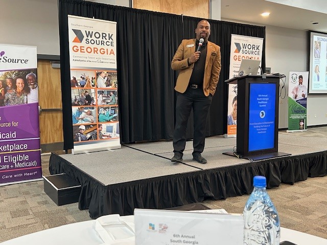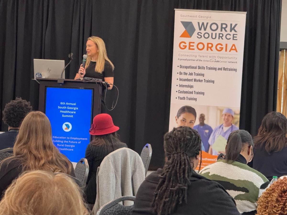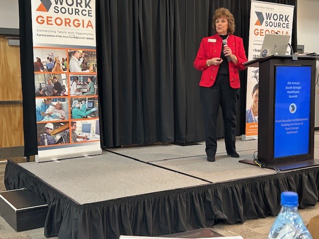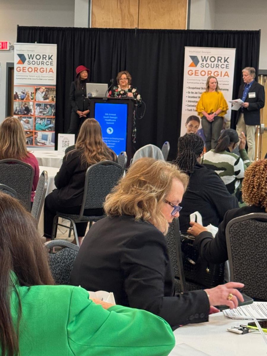 The day began with registration, networking, and vendor visits, giving attendees valuable time to connect and explore resources. Opening announcements were delivered by WorkSource Directors Roberta Lovett and Melody Pierce, setting the tone for a day focused on collaboration and action. Kristen Laarhoven, Executive Director of the Office of Workforce Development at Technical College System of Georgia, officially welcomed participants and emphasized the importance of aligning education and workforce strategies to meet the region’s growing healthcare demands.