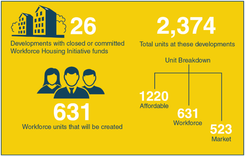 Workforce Housing Initiative, now just over two years old, has so far been a success by nearly every measure. Twenty-six developments have closed or been approved for $59 million in workforce funds. These developments will create or preserve 2,374 units, including 1,220 affordable and 631 workforce units.