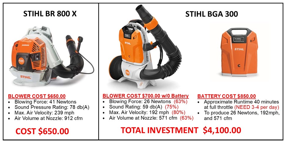 As you most likely know, Pacific has evaluated the developing battery landscape equipment and has a goal of transitioning as the technology becomes affordable to operate. As shown above, operating a backpack blower all day long, especially in the fall, might require up to four high-capacity batteries, bringing the total investment to $4,100 compared to $600 for a gas version. In addition, the strongest battery blower produces only 60–70% of the power of a typical commercial model. The cost to our customers to utilize battery blowers would be staggering, considering the capital cost and reduced productivity. See this article about Oregon State University facilities, which experimented with battery blowers and found them impractical to use: (Gas vs. Electric Leaf Blowers: Which Option Is More Sustainable?)