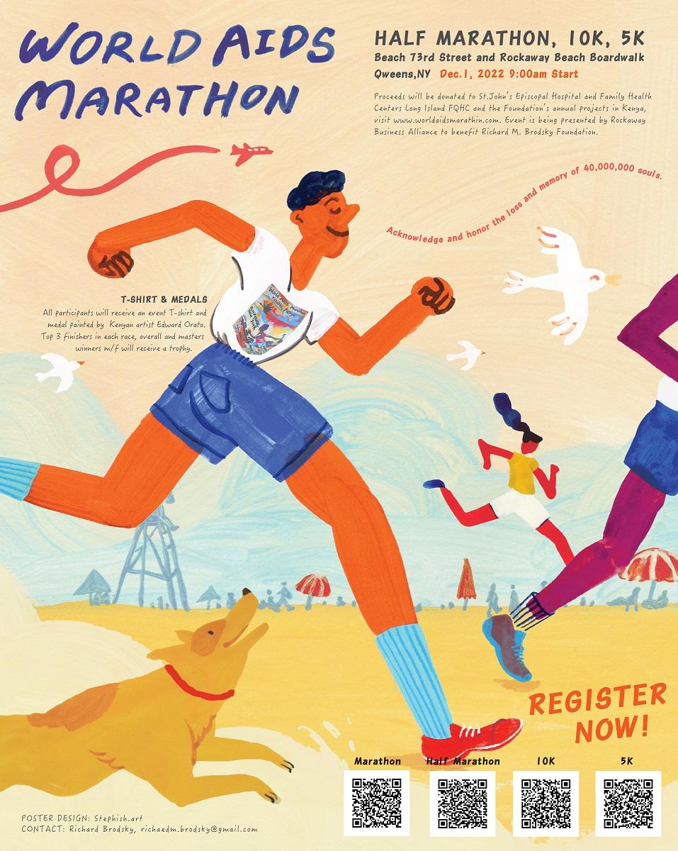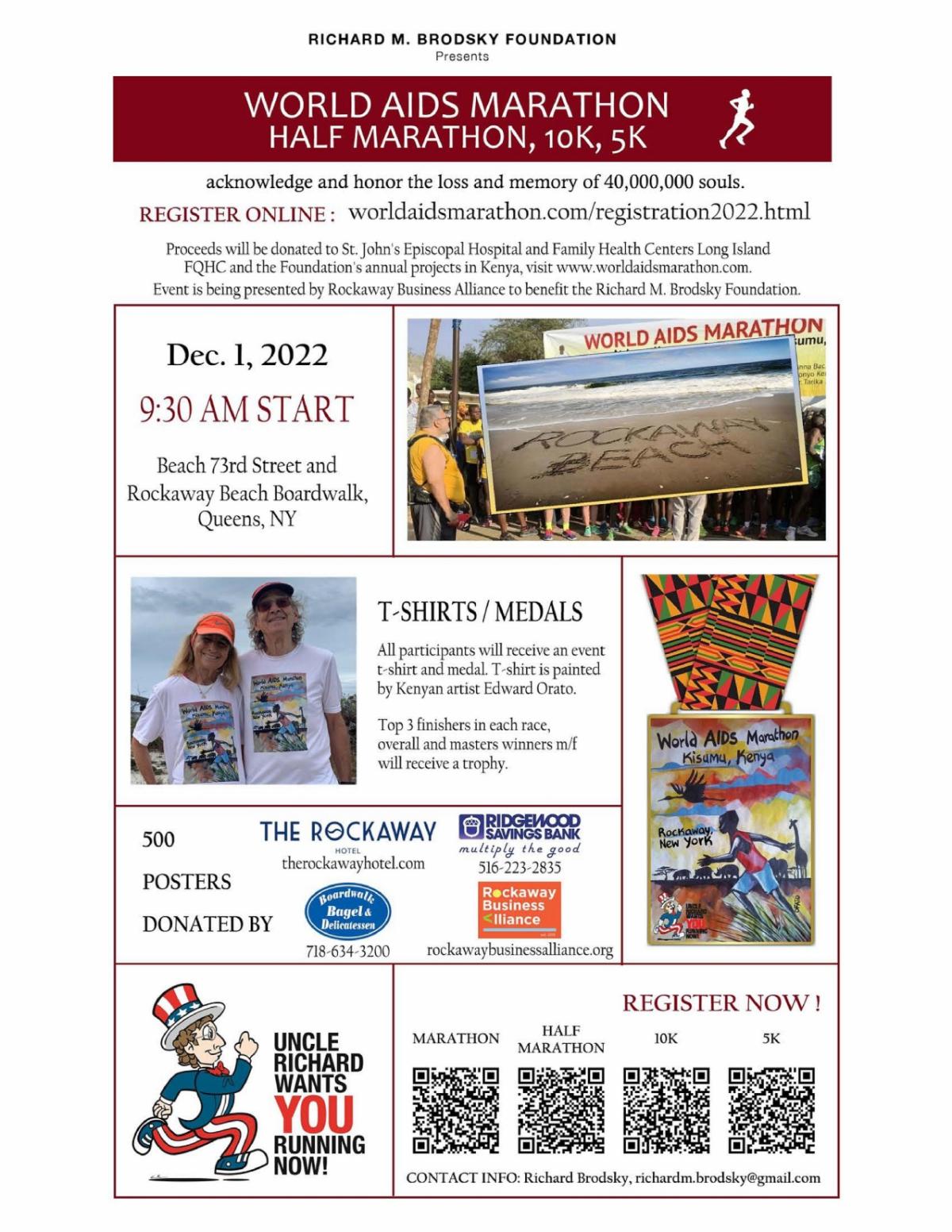 REGISTER NOW for 2022 World AIDS Marathon, half marathon, 10 or 5K! Rockaway beach boardwalk and Beach 73rd street, World AIDS Day, December 1, 2022. This us the only AIDS Marathon in North America on World AIDS Day to honor the 40,000,000 people who have died from AIDS. Participants can run or walk the 5K.