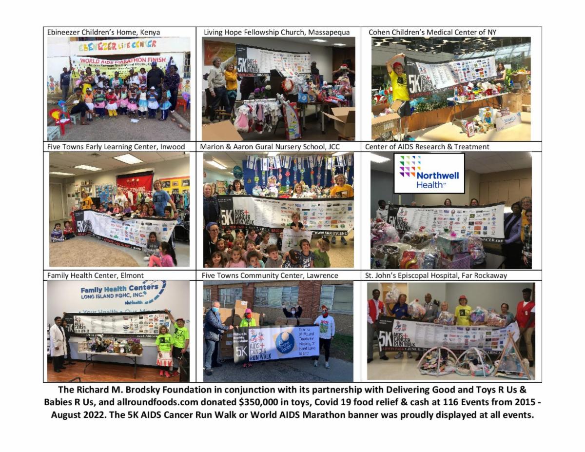 The Foundation donates money to various AIDS projects in Kenya, sponsors orphan dinner dances and provides medical care for Kenyan orphans, AIDS and cancer research projects in America and to organizations providing aid to people living with HIV & cancer. The Foundation also provides toys & cash to local hospitals and toys to pediatricians who care for children in underprivileged areas. To make a donation to the Richard M. Brodsky Foundation you can mail a check to Richard M. Brodsky Foundation, see address below, or visit the Foundation site and click on the PayPal donate link (middle of page). Alternately you can make your donation via the World AIDS Marathon website by donating here.