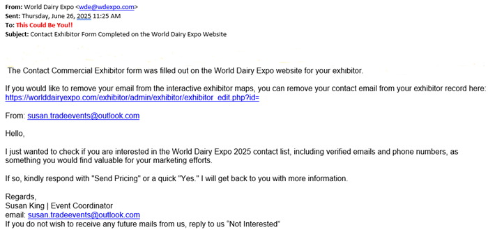 Below is an example of how sophisticated scamming has become. Note that the email appears to have come from wde@wdexpo.com.