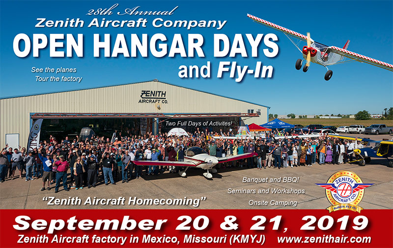 Zenith Homecoming at the kit aircraft factory in Mexico, Missouri. The 28th annual event is a fun and informal gathering of Zenith builders, owners, flyers and enthusiasts, with educational sessions of interest to all. Starting on Friday we'll host seminars and workshops, with the Zenith banquet dinner on Friday evening. Saturday activities include a "Zenith Aircraft Show" and BBQ!