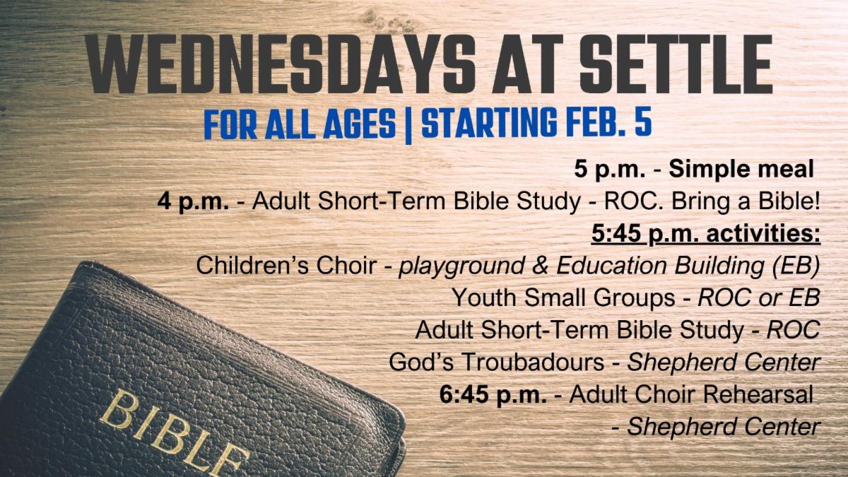 Children: Children of all ages are always welcome to attend worship service with their family. Settle also provides a nursery for ages 0-3 starting at the 9 a.m. Sunday School hour and running through the conclusion of both worship services. For children preschool-Grade 5, Settle offers Sunday School at 9 a.m. in the Education Building, and for preschool-Grade 2, we also offer children's church, where children sit with their parents at the beginning of worship and exit worship as a group after our children's message. Drop off/pickup for all children's activities are in the Education Building.