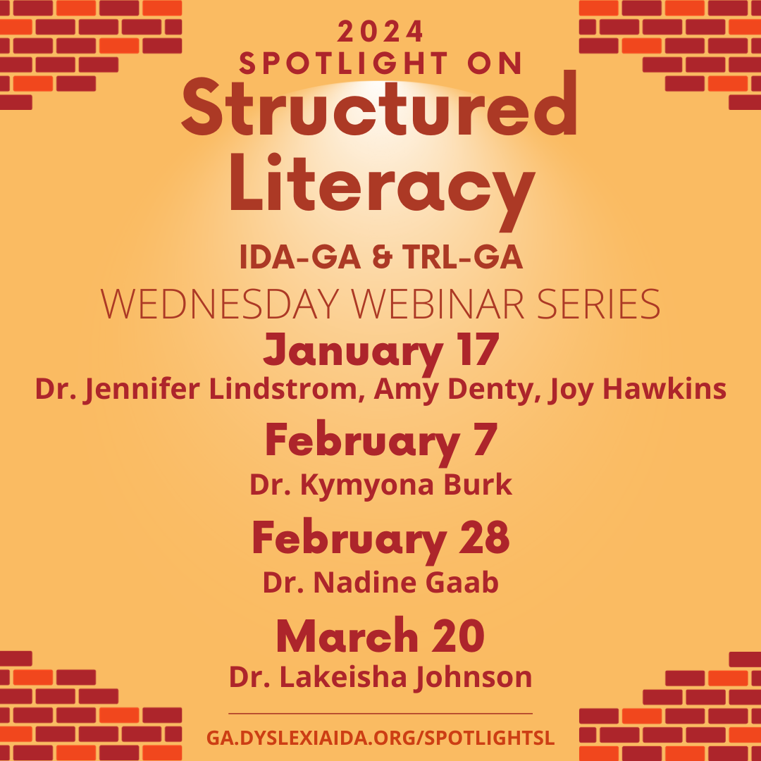 The Spotlight on Structured Literacy series is officially an annual offering by IDA Georgia and The Reading League Georgia. As a part of our outreach, there is no cost to attend. Registered attendees can receive a Certificate of Attendance documenting clock hours. Each webinar will be 1 hour, from 7:00-8:00 pm ET (Presentation and Q&A).