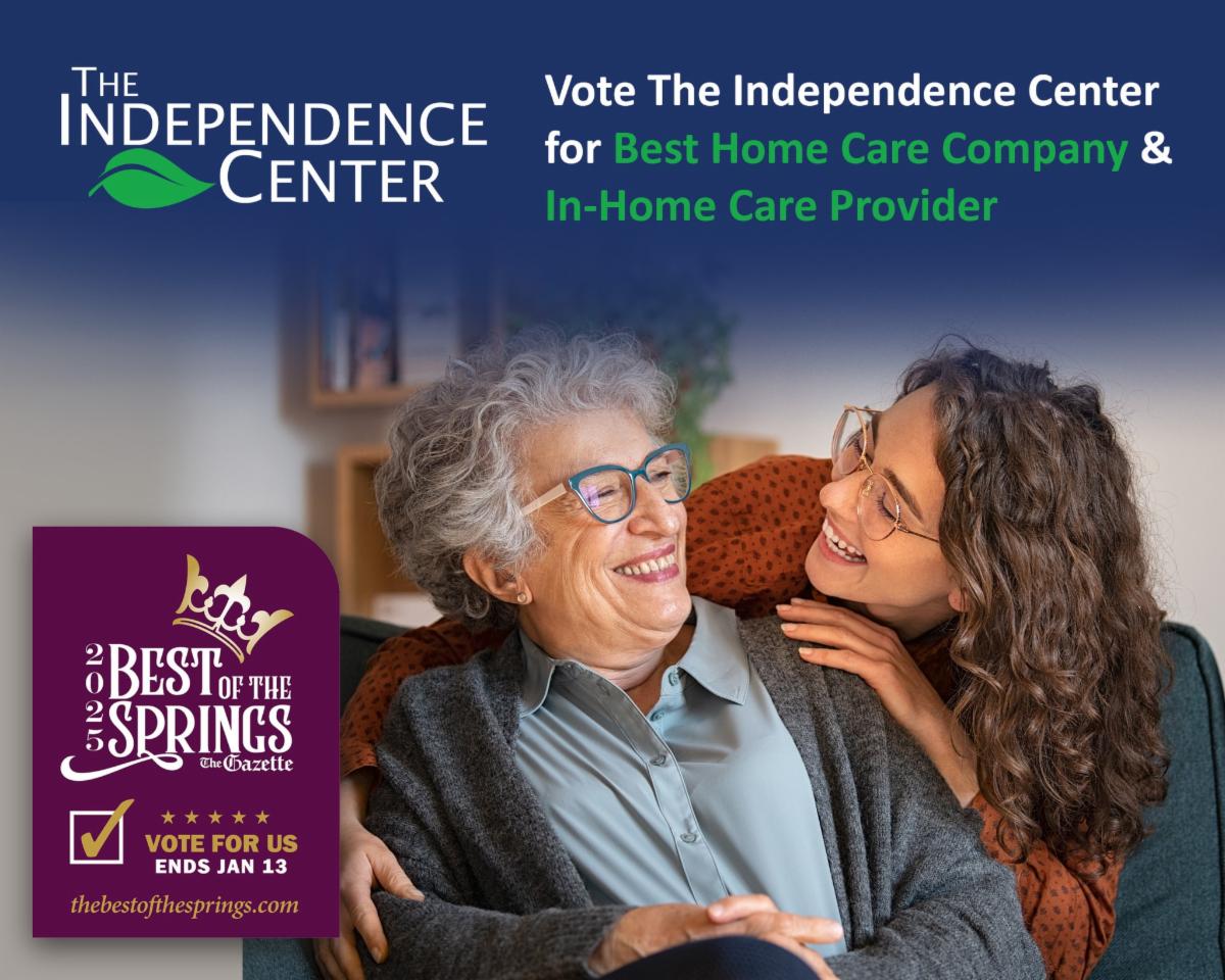 [Image description: The logo of The IC next to text that says "Vote The Independence Center for Best Home Care Company and Best In-Home Care Provider." Below, a smiling young woman hugs the shoulders of an older smiling woman from behind.] | |