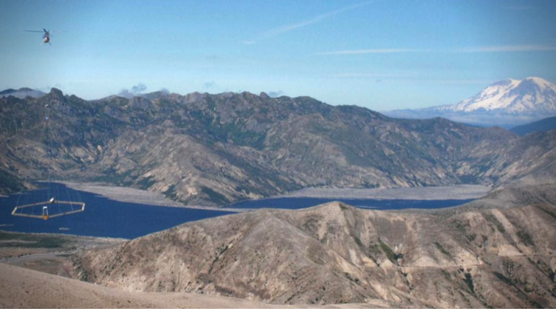 SkyTEM electromagnetic and magnetic survey flying over Spirit Lake, near Mt. St. Helens, Washington. Mt. Adams volcano is in the background. Photo courtesy of U.S. Geological Survey