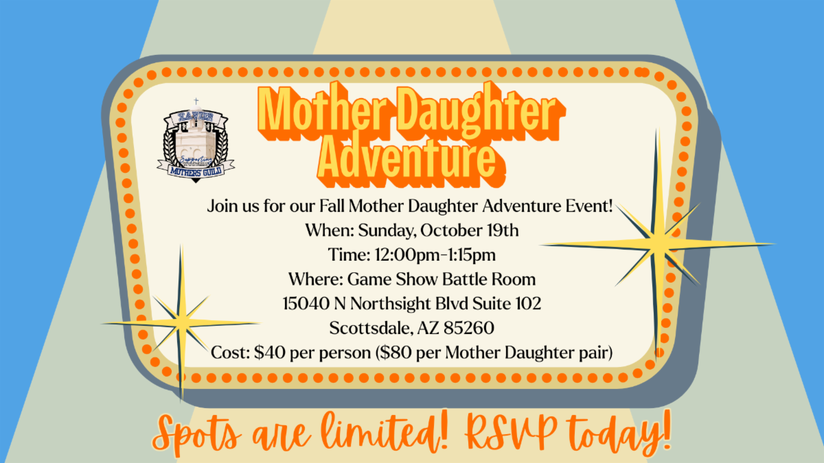 Our next Mothers' Guild meeting will be on Monday, October 6th. Please join us to pray the Rosary at 6:00 p.m. in the Chapel and then head over to Founders for our 6:30 p.m. meeting. We will be having a Q&A with Interim Principal Michaelson and Dean Macrina. Please be sure to RSVP and submit any questions you may have on this link below.