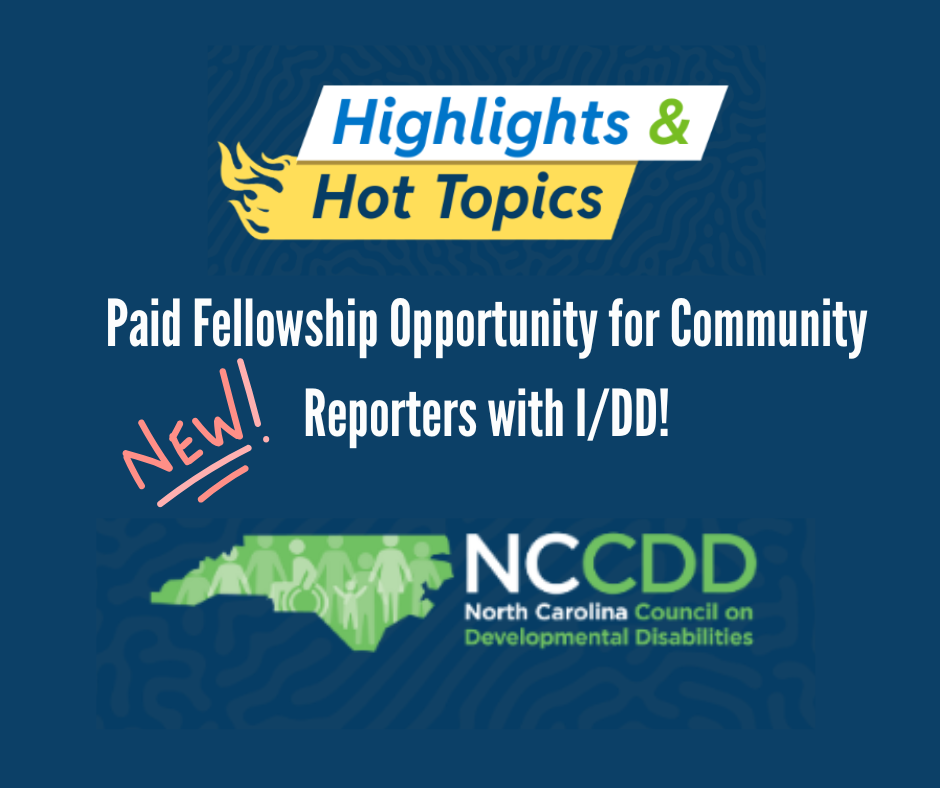 Community Reporters are individuals with I/DD who enjoy storytelling, meeting people, and sharing news from their communities. They will use their skills to collect local stories, interview community members, and create short stories in a format of their choice, such as blog posts, audio or video interviews, graphic art, and infographics. Their stories will be shared on NCCDD’s website, newsletters, and social media. This is a paid, five-month fellowship with a $2,000 stipend. 23 East Group, the marketing and communications agency for the North Carolina Council on Developmental Disabilities, will provide training, monthly check-in sessions, and ongoing support throughout the program