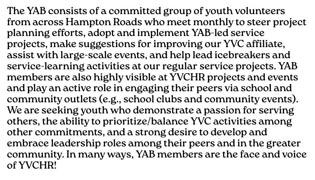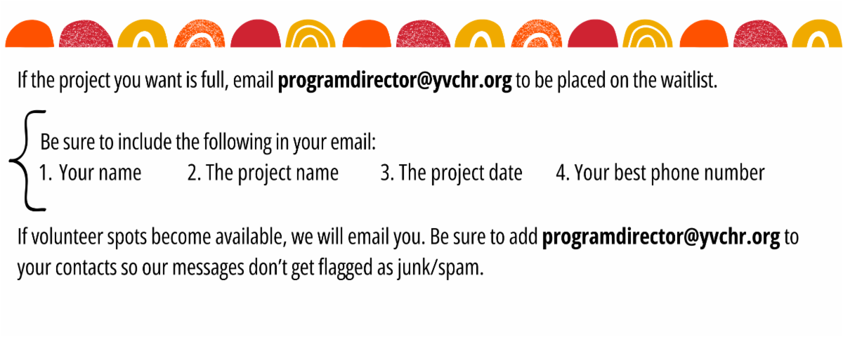 Ready to register for a service project? Follow the steps below. If you do NOT receive a confirmation email after registering, please contact programdirector@yvchr.org.