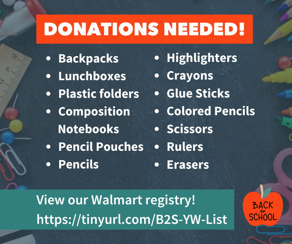 Please drop off donations at our front desk or shop using our Back to School registry.