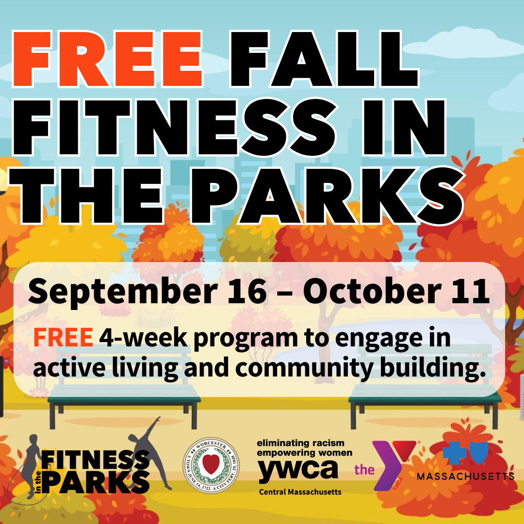 Worcester Fitness in the Parks is a FREE 4- week program presented by the City of Worcester Department of Health and Human Services and Blue Cross Blue Shield of MA, in partnership with the YMCA of Central Massachusetts and YWCA Central Massachusetts.
