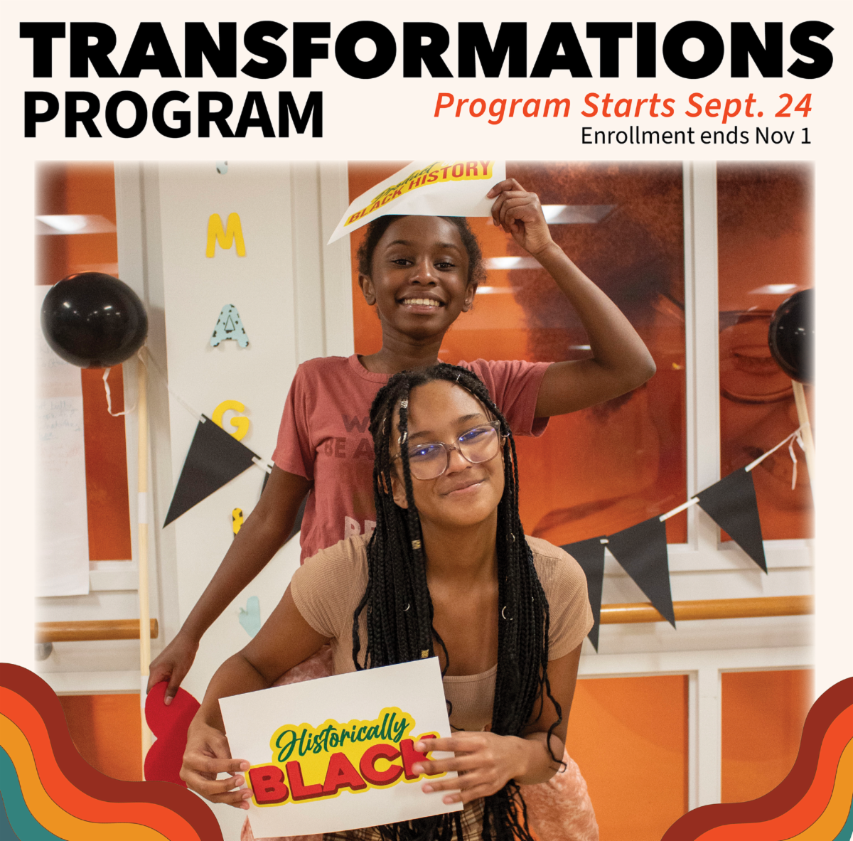 Transformations is a FREE year-long rite of passage program for Black girls, ages 12-14 or in middle school. The program provides positive social, emotional, and cultural identity development that enables Black girls to:
