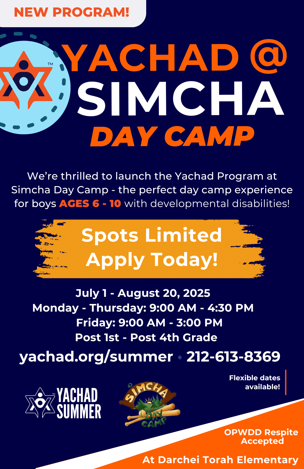Yachad will have their own bunk within Simcha Day Camp for boys ages 6-10 with developmental disabilites.